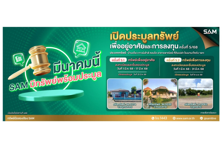โดยการจัดประมูลครั้งนี้ยังมีทรัพย์เด่นที่น่าสนใจในทำเลทั่วประเทศอีกหลายรายการ ผู้สนใจเข้าร่วมประมูล ลงทะเบียนและยื่นซองประมูล พร้อมเอกสารประกอบการประมูลที่กำหนด โดยทรัพย์เพื่อที่อยู่อาศัย (ครั้งที่ 5.1/2568) ภายในวันที่ 17 มี.ค.2568 และกำหนดเปิดซองประมูลวันที่ 25 มี.ค.2568 ส่วนทรัพย์เพื่อการลงทุน (ครั้งที่ 5.2/2568) ภายในวันที่ 31 มี.ค.2568 และกำหนดเปิดซองประมูลวันที่ 8 เม.ย.2568 เวลา 10.00 น. เป็นต้นไป ที่สำนักงานใหญ่ SAM อาคารซันทาวเวอร์ส ถ.วิภาวดีรังสิต กรุงเทพฯ หรือสอบถามรายละเอียดเพิ่มเติมได้ที่ Call Center 1443 / 02-686-1888 และดูรายละเอียดทรัพย์สินได้ทางเว็บไซต์ที่ www.sam.or.th รวมทั้งช่องทางออนไลน์ที่หลากหลายและสะดวกรวดเร็ว โดยแอด ID Line @Samline ติดตาม Facebook Fanpage ทรัพย์มือสองต้อง SAM หรือ SAM NPA Channel บน YouTube เพื่อติดตามข้อมูลข่าวสารดีๆจาก SAM