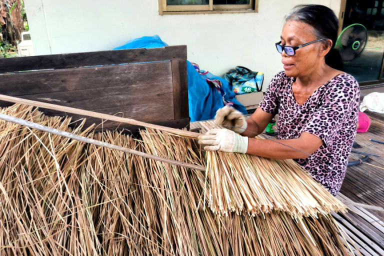 วันที่ 11 มี.ค.68 ผู้สื่อข่าวรายงานว่าชาวบ้านชัยมงคล หมู่ที่ 12 ตำบลกู่จาน อำเภอคำเขื่อนแก้ว จังหวัดยโสธร เป็นหมู่บ้านเล็กๆซึ่งชาวบ้านจะพากันยึดอาชีพถักไพหญ้าแฝกสำหรับมุงหลังคาส่งขายเป็นรายได้โดยเฉพาะในช่วงหน้าแล้งของทุกปีซึ่งต้นหญ้าแฝกที่ขึ้นอยู่ตามป่านาทามและตามหัวไร่ปลายนาซึ่งมีอยู่เป็นจำนวนมากในละแวกชุมชนชาวบ้านจึงได้พากันไปเกี่ยวหญ้าแฝกตามป่าทามและหัวไร่ปลายนาที่แก่เต็มที่และกำลังแห้งในช่วงหน้าแล้งนำมาถักเป็นไพหญ้าสำหรับมุงหลังคากันแดดกันฝนเพื่อส่งขายสร้างรายได้เข้าครอบครัว