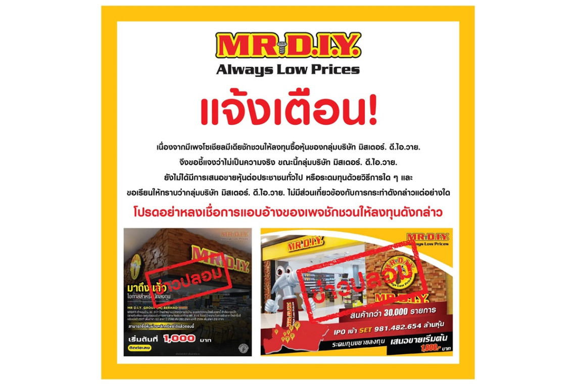 บริษัท มิสเตอร์. ดี.ไอ.วาย. โฮลดิ้ง (ประเทศ) จำกัด (มหาชน) ผู้นำธุรกิจค้าปลีกอุปกรณ์ตกแต่งบ้านและสินค้าไลฟ์สไตล์ แจ้งเตือนประชาชนให้ระมัดระวังการหลอกลวงในรูปแบบการชักชวนลงทุนจองซื้อหุ้นของบริษัทฯ ผ่านโซเชียลมีเดีย เนื่องจากขณะนี้มีผู้หลงเชื่อเป็นจำนวนมาก