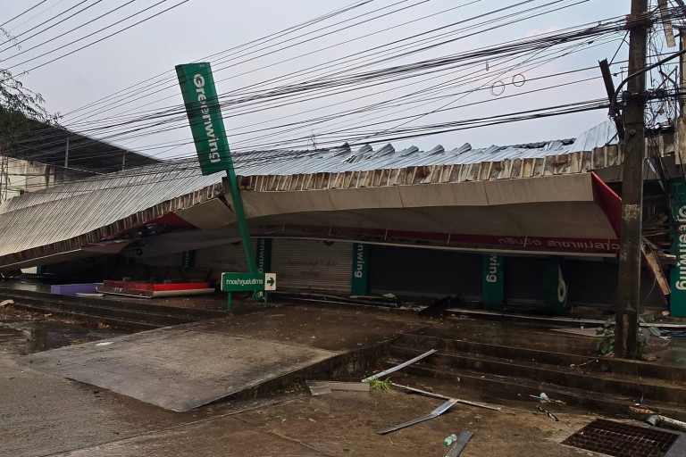 เมื่อเวลา 18.20 น.วันที่ 18 มี.ค.2568 หลังจากอากาศร้อนอบอ้าวมาตลอดทั้งวันได้ทำให้เกิดฝนตกและพายุลมพัดแรงในบางพื้นที่ของ จ.เชียงราย โดยเฉพาะ อ.แม่ลาว นอกจากจะมีฝนและพายุยังมีลูกเห็บตกลงมา ทำให้มีต้นไม้กิ่งไม้หักโค่นบางจุดขวางถนน เช่น บ้านห้วยส้านดอนจั่น ต.จอมหมอกแก้ว และบางส่วนของ ต.ป่าก่อดำ ทำให้อาคารบ้านเรือนหลายแห่งได้รับความเสียหาย โดยเฉพาะส่วนของหลังคาบ้าน รวมทั้งป้ายด้านหน้าปั๊มน้ำมันเชื้อเพลิง ฯลฯ ทำให้ถนนบางสายไม่สามารถสัญจรไปมาได้โดยสะดวก