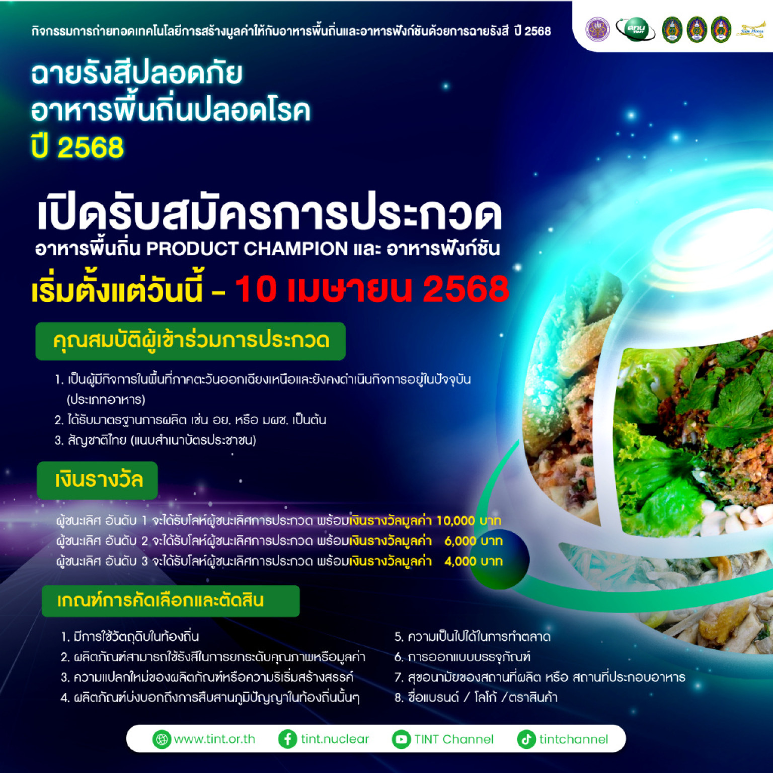 วันที่ 18 มี.ค.68 รศ.ดร.ธวัชชัย อ่อนจันทร์ ผู้อำนวยการสถาบันเทคโนโลยีนิวเคลียร์แห่งชาติ (องค์การมหาชน) เปิดเผยว่า สทน. ได้เปิดรับสมัครการประกวดอาหารพื้นถิ่น Product Champion 2568 และอาหารฟังก์ชัน เพื่อส่งเสริมผู้ประกอบการอาหารภาคอีสานบน ได้แก่ เลย ชัยภูมิ มหาสารคาม เพื่อได้พัฒนาผลิตภัณฑ์อาหารพื้นถิ่น และอาหารฟังก์ชั่น