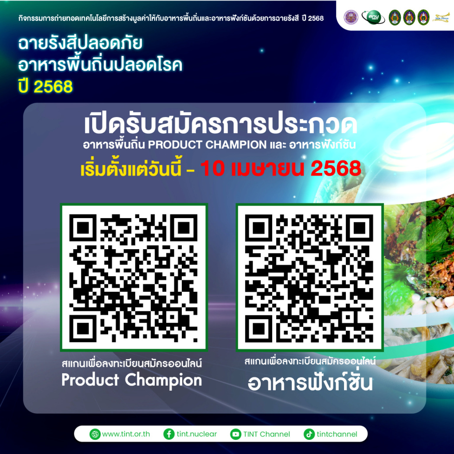 ทั้งนี้ ผู้ประกอบการที่สนใจ สามารถสมัครเข้าร่วมโครงการฟรี พร้อมจะรับคำปรึกษาจากนักวิจัย และทดลองฉายรังสีเพิ่มมูลค่าผลิตภัณฑ์อีกด้วย โดยสมัครได้ตั้งแต่วันนี้ - 10 เม.ย. 2568 กรอกใบสมัครออนไลน์ได้ที่ Product Champion 2568 ได้ที่ https://form.jotform.com/250412525942452 ส่วนอาหารฟังก์ชั่น ได้ที่ https://form.jotform.com/250412741809454 หรือสามารถดาวน์โหลดเอกสารใบสมัครได้ที่ https://drive.google.com/.../1mhBX7BlHAHF9zFbY9yIIsIx3UHu… และส่งใบสมัครทางไลน์หรืออีเมล: event.mpg01@gmail.com สอบถามเพิ่มเติมที่ https://lin.ee/LZ98gsW หรือโทร 08 1906-5165 , 08 5487 4009
