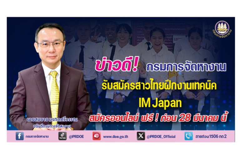 เมื่อวันที่ 27 มีนาคม 2568 นายสมชาย มรกตศรีวรรณ อธิบดีกรมการจัดหางาน เปิดเผยว่า กรมการจัดหางาน ประกาศรับสมัครคัดเลือกผู้ฝึกงานเทคนิคคนไทยไปฝึกงานในประเทศญี่ปุ่นผ่านองค์กร IM Japan ปี 2568 ครั้งที่ 3 (เพศหญิง) ในตำแหน่งผู้ฝึกปฏิบัติงานทางเทคนิค ประเภทงานอุตสาหกรรมการผลิต ระหว่างวันที่ 24 - 28 มีนาคม 2568 โดยผู้ที่สนใจสามารถสมัครสอบได้ที่เว็บไซต์ toea.doe.go.th ไม่มีค่าใช้จ่าย และไม่เว้นวันหยุดราชการ ฟรีค่าตั๋วเครื่องบินไป - กลับ เมื่อฝึกปฏิบัติงานครบ 3 ปี โดยผู้ผ่านการคัดเลือก เดือนแรกจะได้รับเบี้ยเลี้ยง 80,000 เยน หรือประมาณ 18,100 บาท ค่าที่พัก ค่าน้ำ - ค่าไฟ ฟรี เดือนที่ 2 ถึงเดือนที่ 36 จะได้ค่าจ้างไม่น้อยกว่าอัตราค่าจ้างขั้นต่ำที่กฎหมายญี่ปุ่นกำหนด 170,000 เยน หรือประมาณ 38,400 บาทต่อเดือน ไม่รวม ค่าทำงานล่วงเวลา เมื่อฝึกครบตามกำหนด จะได้รับประกาศนียบัตรรับรองการฝึกงาน และเงินสนับสนุนการประกอบอาชีพ จำนวน 600,000 เยน หรือประมาณ 135,800 บาท (ขึ้นกับอัตราแลกเปลี่ยน) เพื่อเป็นค่าใช้จ่ายในการประกอบอาชีพเมื่อเดินทางกลับประเทศไทย