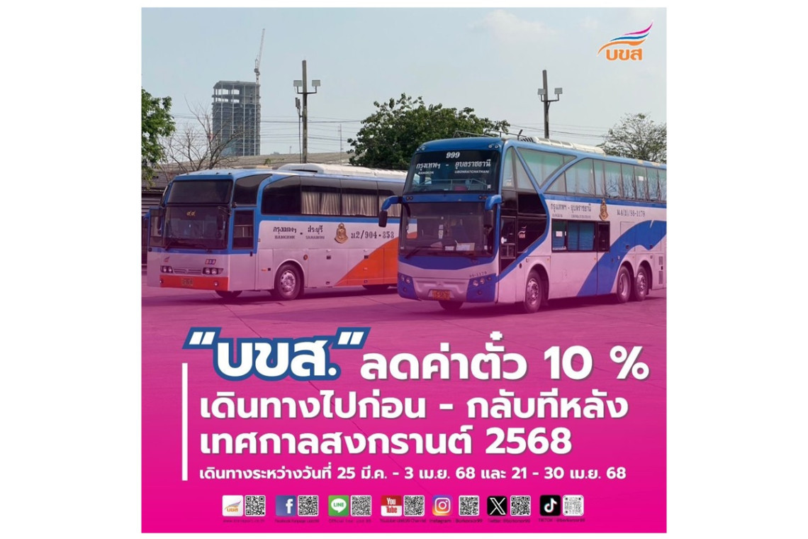 วันที่ 27 มีนาคม 2568 นายชัชวาล พรอมรธรรม กรรมการฯ รักษาการแทนกรรมการผู้จัดการใหญ่ บริษัท ขนส่ง จำกัด (บขส.) กระทรวงคมนาคม เปิดเผยว่า เพื่อเป็นการเตรียมความพร้อมอำนวยความสะดวกและรองรับการเดินทางของประชาชนช่วงเทศกาลสงกรานต์ 2568 ตามนโยบายกระทรวงคมนาคม บขส. จัดกิจกรรมพิเศษมอบเป็น ของขวัญวันสงกรานต์ให้แก่ประชาชน “ปีใหม่ไทยกลับบ้านปลอดภัย ลด 10%” ให้กับผู้โดยสารที่ประสงค์จะเดินทางไปก่อน - กลับทีหลัง โดยรับส่วนลดค่าโดยสาร 10% (ไม่รวมค่าธรรมเนียม) ทุกเส้นทางทั่วประเทศ สำหรับการเดินทางระหว่างวันที่ 25 มีนาคม - 3 เมษายน หรือ 21 - 30 เมษายน 2568 เพื่อลดภาระค่าใช้จ่ายในการเดินทาง ช่วยกระจายปริมาณจราจรบนถนนและบรรเทาปัญหาการจราจรติดขัดในการเดินทางกลับภูมิลำเนาในช่วงเทศกาล ตลอดจนส่งเสริมให้ประชาชนเดินทางด้วยระบบขนส่งสาธารณะ