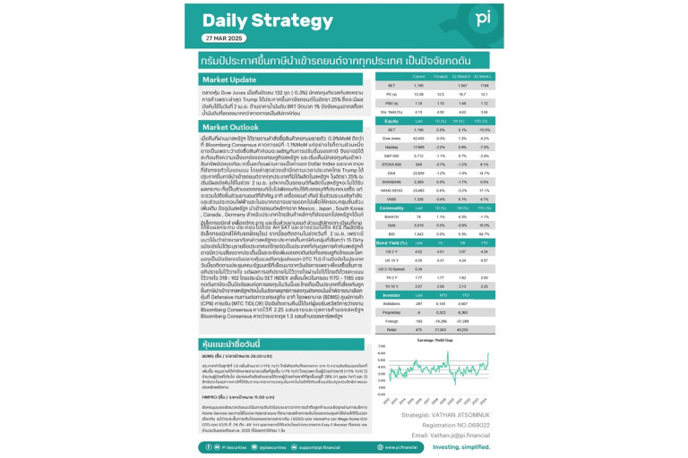 วันที่ 27 มีนาคม 2568 บล.พาย เผยว่า ตลาดหุ้น Dow Jones เมื่อคืนปิดลบ 132 จุด (-0.3%) นักลงทุนกังวลกับสงครามการค้าเพราะล่าสุด Trump ได้ประกาศขึ้นภาษีรถยนต์ในอัตรา 25% ซึ่งจะมีผลบังคับใช้ในวันที่ 2 เม.ย. ด้านราคาน้ำมันดิบ BRT ปิดบวก 1% ปัจจัยหนุนจากสต็อกน้ำมันดิบที่ลดลงมากกว่าคาดการณ์ในสัปดาห์ก่อน