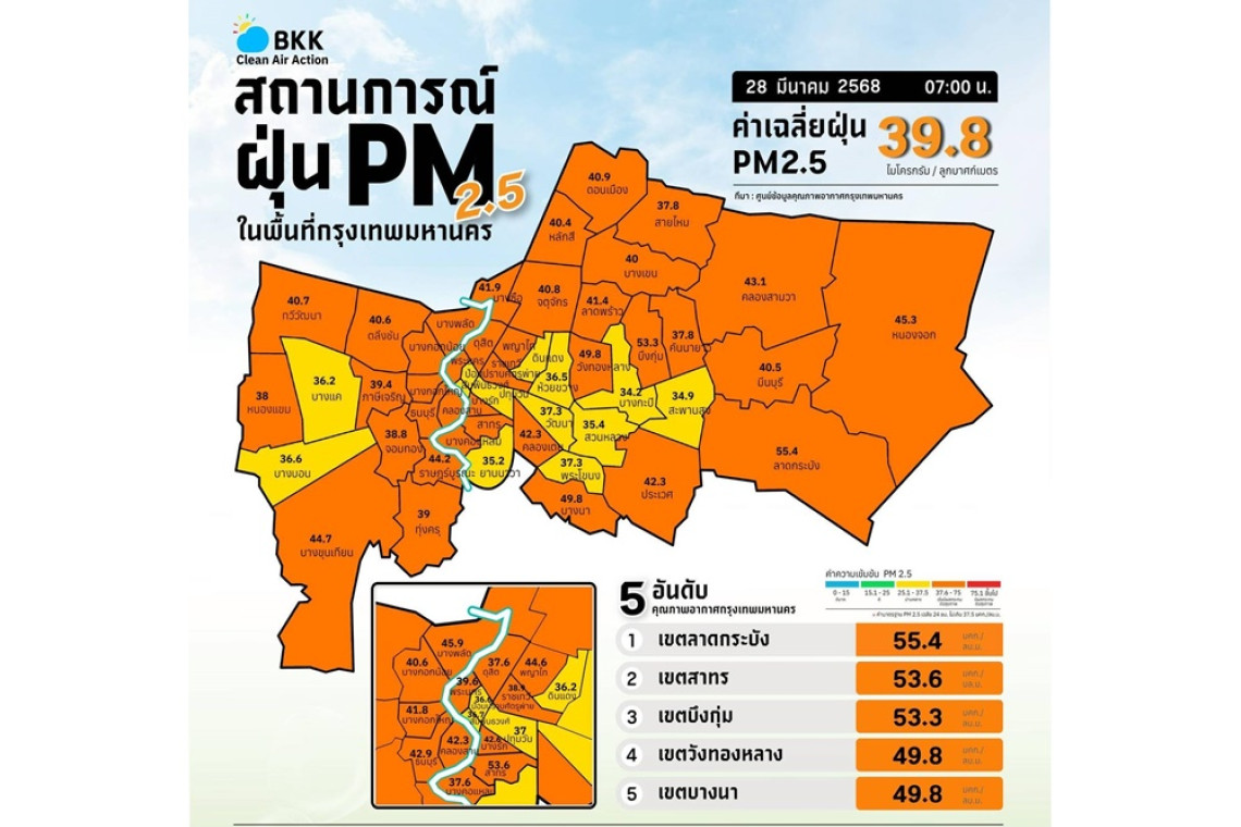 วันที่ 28 มี.ค.68 ศูนย์ข้อมูลคุณภาพอากาศกรุงเทพมหานครรายงานสถานการณ์ฝุ่น PM 2.5 วันที่ 28 มีนาคม พ.ศ. 2568 เวลา 07.00 น.ค่าเฉลี่ยของกรุงเทพมหานคร 39.8 มคก./ลบ.ม.