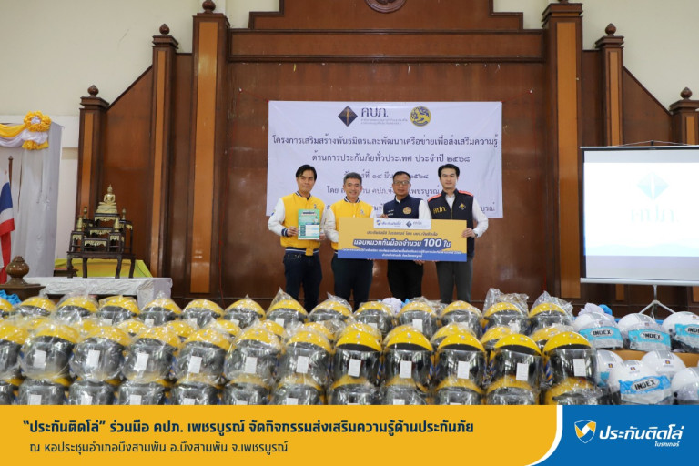 นอกจากนี้ ภายในกิจกรรม “ประกันติดโล่” ยังได้มอบสื่อความรู้เกี่ยวกับประโยชน์ของ พ.ร.บ. ให้กับผู้นำชุมชน เพื่อนำไปเผยแพร่ความรู้ให้กับประชาชนในพื้นที่ต่อไป พร้อมมอบหมวกกันน็อก จำนวน 100 ใบ เพื่อส่งเสริมความปลอดภัยบนท้องถนน โดยมี คุณสุเทพ เบียร์ดี (ที่ 2 จากขวา) นายอำเภอบึงสามพัน และ คุณสมเจตน์ พรมมา (ที่ 1 จากขวา) ผู้เชี่ยวชาญพิเศษ รักษาการในตำแหน่ง ผอ. สำนักงาน คปภ. จังหวัดเพชรบูรณ์ ให้เกียรติเป็นตัวแทนรับมอบและให้การต้อนรับอย่างเป็นกันเอง ณ หอประชุมอำเภอบึงสามพัน อ.บึงสามพัน จ.เพชรบูรณ์ เมื่อเร็วๆ นี้