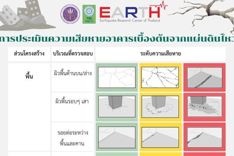 โดยได้ให้รายละเอียดการประเมินความเสียหาย ทั้งในส่วนโครงสร้าง พื้น คาน เสา และกำแพงคอนกรีตเสริมเหล็ก ว่าความเสียหายขนาดไหน สามารถเข้าใช้งานได้ หรือเข้าข่ายต้องตรวจสอบเพิ่มเติมโดยผู้เชี่ยวชาญ หรือถึงขั้นเสียหายมาก ห้ามใช้งานเด็ดขาด