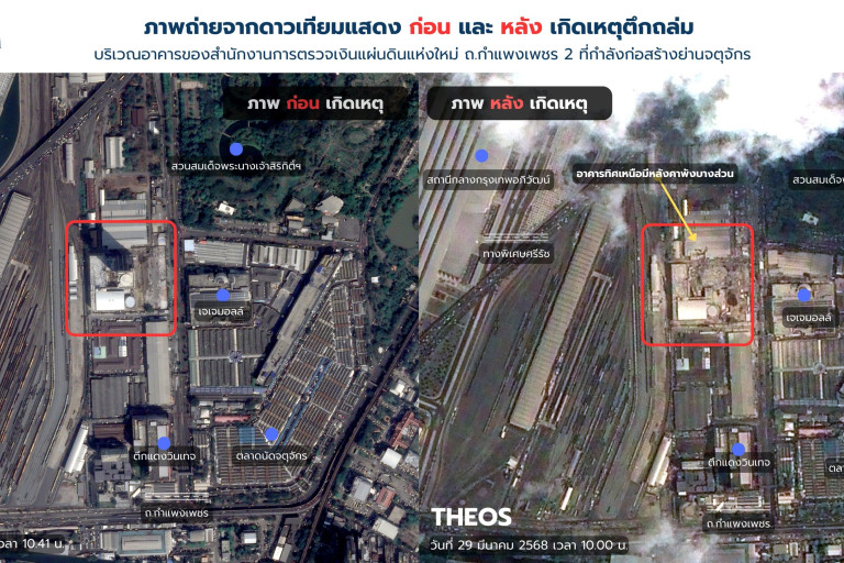 GISTDA เผยภาพถ่ายจากดาวเทียม THEOS-2 ของวันที่ 14 กุมภาพันธ์ 2568 (ภาพก่อนเกิดเหตุ) เปรียบเทียบกับภาพถ่ายจากดาวเทียม THEOS (ภาพหลังเกิดเหตุ) ซึ่งบันทึกภาพเมื่อเวลา 10:00 น. ของวันที่ 29 มีนาคม 2568 แสดงให้เห็นถึงความเสียหาย บริเวณอาคารของสำนักงานการตรวจเงินแผ่นดินแห่งใหม่ บนถนนกำแพงเพชร 2 ที่กำลังก่อสร้างย่านจตุจักรถล่ม หลังเกิดเหตุแผ่นดินไหวที่มีศูนย์กลางอยู่ที่ประเทศเมียนมา ซึ่งส่งผลให้ประเทศไทยรู้สึกถึงความสั่นไหวในหลายพื้นที่ ทั้งบริเวณภาคเหนือ ภาคกลาง รวมถึงกรุงเทพมหานคร และส่งผลทำให้ตึกและอาคารสูงในกรุงเทพมหานครได้รับความเสียหายหลายแห่ง