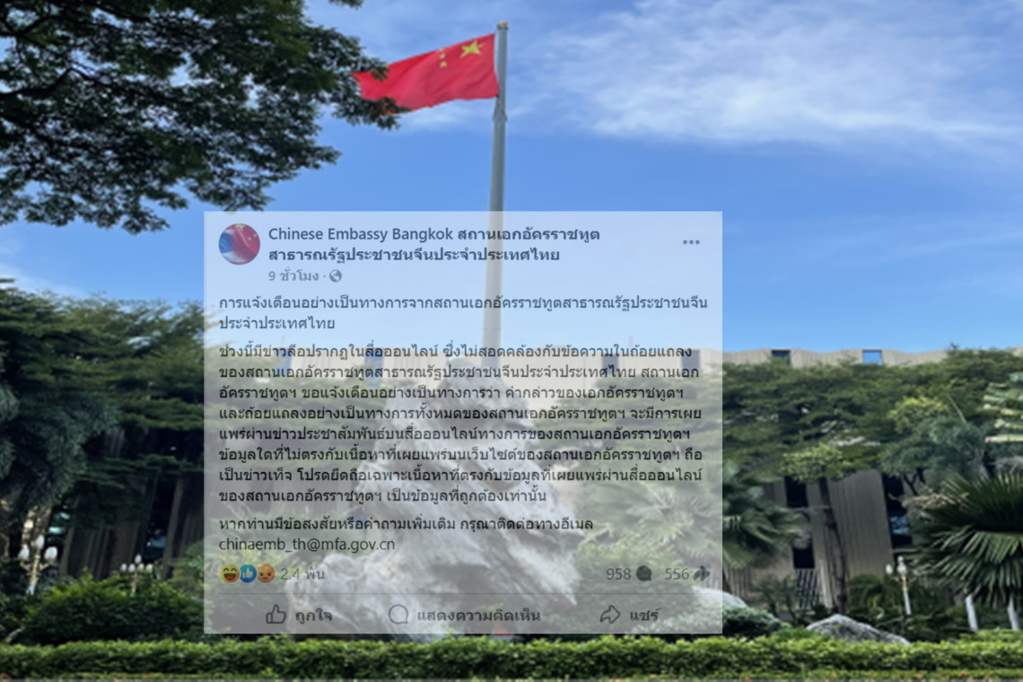 ช่วงนี้มีข่าวลือปรากฏในสื่อออนไลน์ ซึ่งไม่สอดคล้องกับข้อความในถ้อยแถลงของสถานเอกอัครราชทูตสาธารณรัฐประชาชนจีนประจำประเทศไทย สถานเอกอัครราชทูตฯ ขอแจ้งเตือนอย่างเป็นทางการว่า คำกล่าวของเอกอัครราชทูตฯ และถ้อยแถลงอย่างเป็นทางการทั้งหมดของสถานเอกอัครราชทูตฯ จะมีการเผยแพร่ผ่านข่าวประชาสัมพันธ์บนสื่อออนไลน์ทางการของสถานเอกอัครราชทูตฯ ข้อมูลใดที่ไม่ตรงกับเนื้อหาที่เผยแพร่บนเว็บไซต์ของสถานเอกอัครราชทูตฯ ถือเป็นข่าวเท็จ โปรดยึดถือเฉพาะเนื้อหาที่ตรงกับข้อมูลที่เผยแพร่ผ่านสื่อออนไลน์ของสถานเอกอัครราชทูตฯ เป็นข้อมูลที่ถูกต้องเท่านั้น