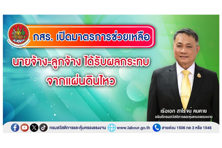 วันที่ 6 เมษายน 2568 เรือเอก สาโรจน์ คมคาย อธิบดีกรมสวัสดิการและคุ้มครองแรงงาน (กสร.) เปิดเผยว่า จากเหตุการณ์แผ่นดินไหวที่เกิดขึ้นเมื่อวันที่ 28 มีนาคมที่ผ่านมา ส่งผลให้สถานประกอบกิจการหลายแห่งและลูกจ้างได้รับผลกระทบ โดยนายพิพัฒน์ รัชกิจประการ รัฐมนตรีว่าการกระทรวงแรงงาน ได้แสดงความห่วงใยและเร่งให้ความช่วยเหลือแรงงานทุกกลุ่มอย่างเร่งด่วน พร้อมทั้งกำชับให้กรมสวัสดิการและคุ้มครองแรงงาน เร่งสำรวจสถานประกอบกิจการและลูกจ้างที่ได้รับผลกระทบจากเหตุการณ์แผ่นดินไหวครั้งนี้และให้ความคุ้มครองตามกฎหมายอย่างเต็มที่เพื่อบรรเทาผลกระทบและให้ทุกฝ่ายสามารถกลับมาดำเนินชีวิตได้อย่างปกติและฟื้นฟูกิจการได้โดยเร็ว