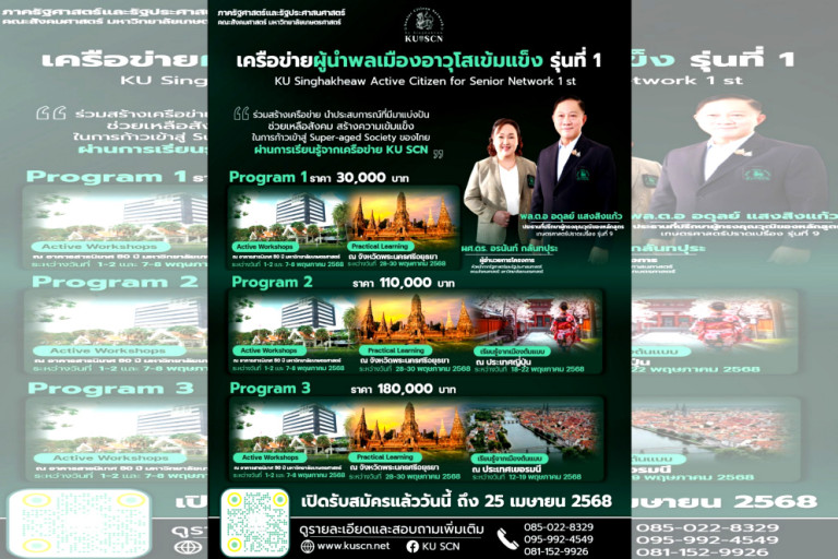มหาวิทยาลัยเกษตรศาสตร์ เปิดหลักสูตรการอบรมพลเมืองที่ทันสมัยและมีบทบาทในการพัฒนาเครือข่ายสังคมผู้นำอาวุโสให้กับประเทศไทย เป็นครั้งแรก ภายใต้ชื่อ "โครงการประกาศนียบัตรเครือข่ายสิงห์เขียวเพื่อพลเมืองเข้มแข็งสำหรับผู้นำอาวุโส รุ่นที่ 1 (KU Singhakeaw Active Citizen for Senior Network 1st: KU SCN 1st)" จัดโดยภาควิชารัฐศาสตร์และรัฐประศาสนศาสตร์ คณะสังคมศาสตร์ มหาวิทยาลัยเกษตรศาสตร์