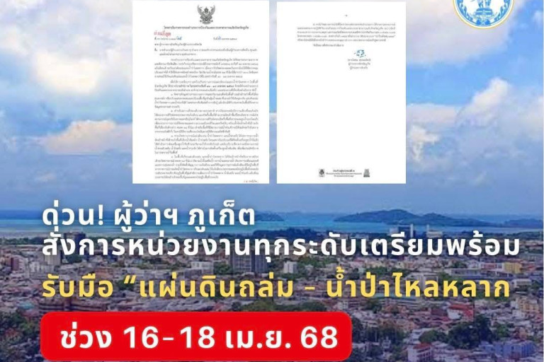 ผู้ว่าฯภูเก็ต สั่งการรับมือ “แผ่นดินถล่ม-น้ำป่าไหลหลาก” ช่วง 16–18 เม.ย. 68