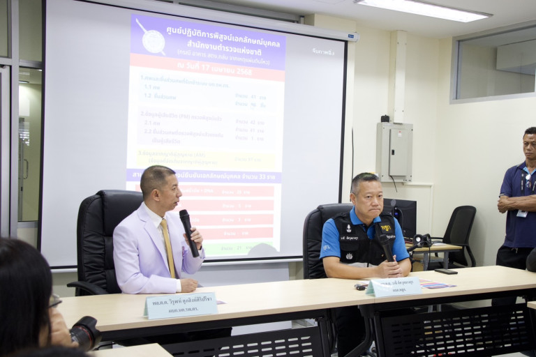 เมื่อวันที่ 17 เมษายน 2568 ที่ศูนย์ปฏิบัติการพิสูจน์เอกลักษณ์บุคคล สถาบันนิติเวช โรงพยาบาลตำรวจ สำนักงานตำรวจแห่งชาติ พล.ต.ต. วาที อัศวุตมางกุร ผู้บังคับการสำนักงานพิสูจน์หลักฐานกลาง (พฐก.) และโฆษกสำนักงานพิสูจน์หลักฐานตำรวจ ร่วมแถลงข่าวกับ พล.ต.ต. วิรุฬห์ ศุภสิงห์ศิริปรีชา ผู้บังคับการโรงพยาบาลตำรวจ ถึงความคืบหน้าการพิสูจน์เอกลักษณ์บุคคล เพื่อยืนยันตัวตนผู้เสียชีวิตและส่งคืนศพให้ญาติไปประกอบพิธีทางศาสนา