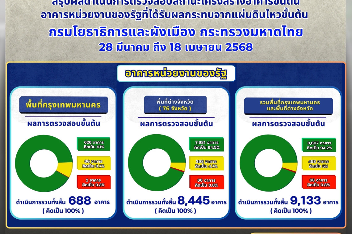 ตั้งแต่ วันที่ 28 มี.ค.–18 เม.ย.2568 ทั้งในกรุงเทพมหานคร และต่างจังหวัด รวมทั้งสิ้น จำนวน 9,035 อาคาร สามารถใช้งานได้ปกติ สีเขียว จำนวน 8,511 อาคาร / มีความเสียหายปานกลาง สามารถใช้งานได้ สีเหลือง จำนวน 456 อาคาร / โครงสร้างมีความเสียหายอย่างหนักโดยได้สั่งให้ระงับการใช้งานอาคาร สีแดง จำนวน 68 อาคาร