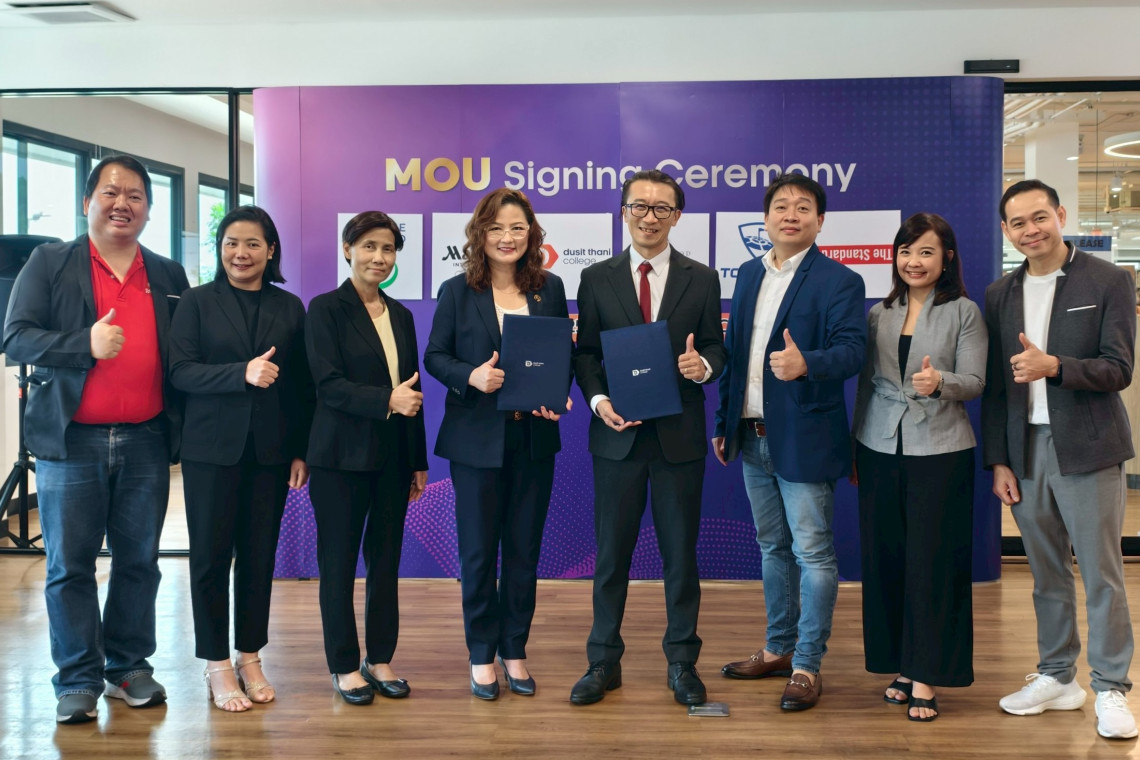 คุณสุขวสา ภูชัชวนิชกุล (ที่ 4 จากซ้าย) ผู้ช่วยกรรมการผู้จัดการใหญ่ บริษัท พีทีจี เอ็นเนอยี จำกัด (มหาชน) ร่วมลงนามความร่วมมือกับ ดร.อรรถเวทย์ พฤกษ์สถาพร (ที่ 5 จากซ้าย) อธิการบดี วิทยาลัยดุสิตธานี เพื่อเปิดโอกาสให้นักศึกษาได้พัฒนาศักยภาพด้านการทำงานในอุตสาหกรรมการท่องเที่ยว รวมถึงการบริการอาหาร และเครื่องดื่ม ผ่านการฝึกปฏิบัติงานจริง เพื่อเตรียมความพร้อมก่อนก้าวเข้าสู่การทำงานอย่างมืออาชีพ อีกทั้งยังเป็นการวางรากฐานให้นักศึกษาได้มีโอกาสร่วมงานกับพีทีจี และบริษัทในเครือทั้ง กาแฟพันธุ์ไทย, คอฟฟี่ เวิลด์, ซับเวย์ รวมถึงแบรนด์อาหารและเครื่องดื่มอื่นๆ พร้อมทั้งสนับสนุนและต้อนรับบุคลากรรุ่นใหม่ที่มีคุณภาพเข้าสู่ทีมอย่างต่อเนื่อง จัดขึ้น ณ Co–Working Space วิทยาลัยดุสิตธานี