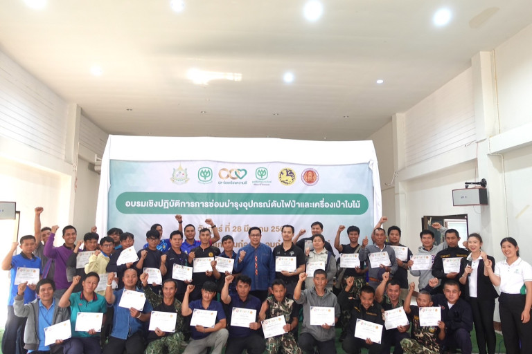 นายชุมพลภัทร์ คงธนจารุอนันต์ ผู้จัดการสำนักปกป้องและฟื้นฟูสิ่งแวดล้อม ฝ่ายปฏิบัติการเพื่อสังคม มูลนิธิเจริญโภคภัณฑ์พัฒนาชีวิตชนบท เปิดเผยว่า เมื่อเดือนกุมภาพันธ์ 2568 เครือเจริญโภคภัณฑ์ (ซีพี) ได้มอบกองทุนประกันภัยและอุปกรณ์ดับไฟป่าแก่กลุ่มอาสาสมัครในจังหวัดเชียงใหม่ ภายใต้โครงการ "อมก๋อยโมเดล" ซึ่งเป็นหนึ่งในโครงการพัฒนาความยั่งยืนของมูลนิธิฯ ในพื้นที่ เพื่อเสริมศักยภาพในการปฏิบัติงาน ทั้งนี้มูลนิธิฯ ได้จัดการอบรมเชิงปฏิบัติการเรื่อง “การซ่อมบำรุงอุปกรณ์ดับไฟป่าและเครื่องเป่าใบไม้” โดยมุ่งหวังให้ผู้เข้าร่วมมีความรู้พื้นฐานในการดูแลและซ่อมแซมอุปกรณ์ด้วยตนเอง ซึ่งจะช่วยยืดอายุการใช้งาน และลดปัญหาอุปกรณ์ชำรุดระหว่างภารกิจ เนื่องจากภารกิจดับไฟป่าเต็มไปด้วยความเสี่ยงและต้องใช้แรงกายอย่างมาก การมีอุปกรณ์ที่พร้อมใช้งานจึงถือเป็นปัจจัยสำคัญต่อประสิทธิภาพของทีมอาสาสมัคร ซึ่งการอบรมครั้งนี้ได้รับความร่วมมือจากวิทยาลัยเทคนิคเชียงใหม่ โดยแผนกวิชาช่างยนต์ โครงการพิเศษและบริการชุมชน ส่งวิทยากรผู้เชี่ยวชาญมาร่วมถ่ายทอดองค์ความรู้และฝึกปฏิบัติอย่างเข้มข้นตลอดหลักสูตร