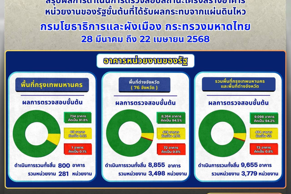 สรุปผลการตรวจสอบอาคารภาครัฐที่ดำเนินการตรวจสอบอาคารที่ได้รับความเสียหายจากแผ่นดินไหว ตั้งแต่ วันที่ 28 มีนาคม – 22 เมษายน 2568 ทั้งในกรุงเทพมหานคร และต่างจังหวัด รวมทั้งสิ้น จำนวน 9,655 อาคาร สามารถใช้งานได้ปกติ สีเขียว จำนวน 9,098 อาคาร / มีความเสียหายปานกลาง สามารถใช้งานได้ สีเหลือง จำนวน 484 อาคาร / โครงสร้างมีความเสียหายอย่างหนักโดยได้สั่งให้ระงับการใช้งานอาคาร สีแดง จำนวน 73 อาคาร นอกจากนี้ กรมโยธาธิการและผังเมืองมีช่องทางให้เจ้าของอาคาร ผู้ตรวจสอบอาคาร หรือพี่น้องประชาชน สามารถรับทราบข้อมูลต่าง ๆ และให้คำปรึกษาผ่านช่องทางการประชาสัมพันธ์ของกรมฯ สื่อมวลชน โทรทัศน์ วิทยุหนังสือพิมพ์ และสื่อออนไลน์ ปัจจุบันกรมโยธาธิการและผังเมืองเปิดสายด่วนสำหรับขอรับคำปรึกษาและแจ้งเหตุที่หมายเลข 1531 / 02 299 4191 และ 02 299 4312