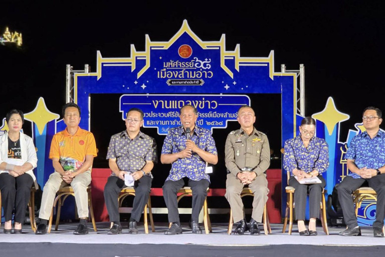 วันที่ 23 เม.ย.68 ผู้สื่อข่าวรายงาน ว่า ที่สะพานสราญวิถี อ.เมืองประจวบฯ นายสิทธิชัย สวัสดิ์แสน ผู้ว่าราชการ จ.ประจวบฯ เป็นประธานแถลงข่าวการจัดงาน "ท่องเที่ยวประจวบคีรีขันธ์ มหัศจรรย์เมืองสามอ่าว และงานกาชาด” ประจำปี 2568 ระหว่างวันที่ 25 เม.ย. -วันที่ 4 พ.ค.68 ที่บริเวณสวนสาธารณะเฉลิมพระเกียรติฯ ร.9 หน้าศาลากลางจังหวัดฯ และถนนเลียบชายทะเลอ่าวประจวบฯ มี นายสุธี เล้าสุบินประเสริฐ ปลัดจังหวัดประจวบฯ นายสราวุธ ลิ้มอรุณรักษ์ นายกองค์การบริหารส่วนจังหวัดประจวบฯ นางรัชนีวรรณ พรมเล็ก ปลัดเทศบาล ปฏิบัติหน้าที่นายกเทศมนตรีเมืองประจวบฯ พล.ต.ต.นครินทร์ สุคนธวิธ ผบก.ภ.จ.ประจวบฯ นายธณัท ปภพธนานนท์ รักษาราชการแทนท่องเที่ยวและกีฬาจังหวัดประจวบฯ และ นางสาวอุบลวรรณ คงสว่าง ผู้ประสานงานเครือข่ายงดเหล้า ภาคตะวันตก สำนักงานเครือข่ายองค์กรงดเหล้า (สคล.) ร่วมแถลงข่าวท่ามกลางแขกผู้มีเกียรติจำนวนมากร่วมรับฟัง จัดขึ้นเพื่อเผยแพร่อัตลักษณ์วัฒนธรรม ภูมิปัญญาท้องถิ่น กระตุ้นเศรษฐกิจของจังหวัดฯ ชู Soft Power ส่งเสริมการท่องเที่ยวประจวบฯ รวมถึงหารายได้สนับสนุนกิจกรรมสาธารณะประโยชน์ของสำนักงานเหล่าชาดจังหวัดประจวบฯ พร้อมชมการแสดงมหัศจรรย์ “ผีพุ่งไต้” เอกภาพบนความหลากหลาย Amazing shooting star : Diversity in Hamony อย่างตื่นตาตื่นใจ
