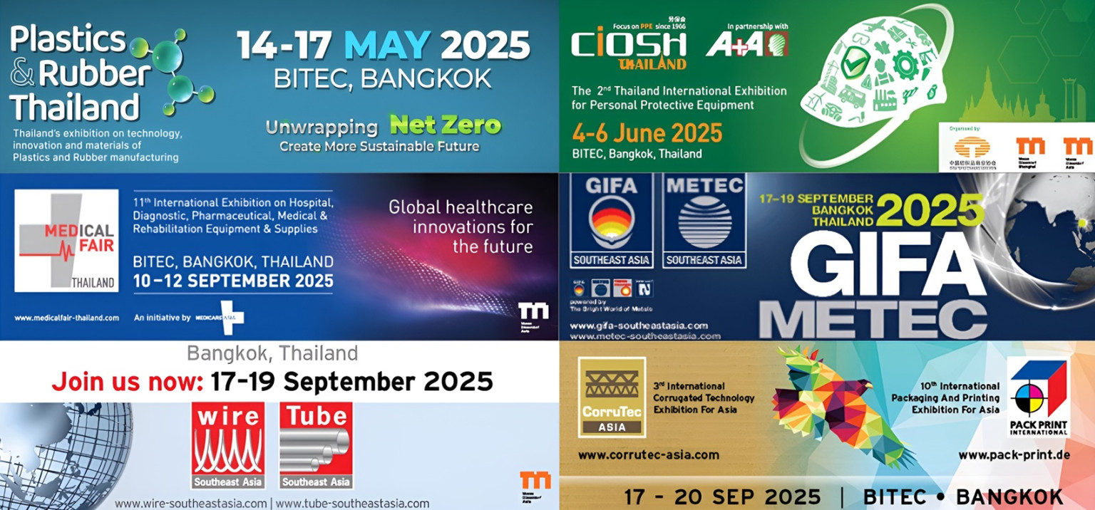 • METEC Southeast Asia 2025 – จัดคู่กับ GIFA Southeast Asia 2025 โดยนำเสนอความก้าวหน้าของเทคโนโลยีโลหการ รวมถึงอุปกรณ์ และโซลูชันเพื่อเพิ่มประสิทธิภาพกระบวนการผลิตและประหยัดทรัพยากร