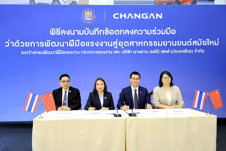 วันที่ 24 เมษายน 2568 นางจิรวรรณ สุตสุนทร รองอธิบดีกรมพัฒนาฝีมือแรงงาน กล่าวหลังจากลงนามว่า อุตสาหกรรมยานยนต์เป็นหนึ่งในอุตสาหกรรมหลักที่ขับเคลื่อนเศรษฐกิจของประเทศ และกำลังเผชิญกับการเปลี่ยนแปลงจากกระแสเทคโนโลยียานยนต์ไฟฟ้า (EV) และระบบขับเคลื่อนอัจฉริยะ ซึ่งต้องอาศัยบุคลากรที่มีความเชี่ยวชาญและทักษะที่สอดคล้องกับความต้องการของอุตสาหกรรมในยุคปัจจุบันและอนาคต จึงทำให้ตลาดแรงงานมีความต้องการช่างซ่อมบำรุงรถยนต์ไฟฟ้าเป็นจำนวนมาก ซึ่งการลงนามความร่วมมือในครั้งนี้ CHANGAN และกรมพัฒนาฝีมือแรงงาน ได้ร่วมมือกัน ผ่านสถาบันพัฒนาบุคลากรในอุตสาหกรรมยานยนต์และชิ้นส่วนอะไหล่ (AHRDA) โดยพัฒนาหลักสูตรการฝึกอบรมด้านงานซ่อมบำรุงและบริการรถยนต์ไฟฟ้า และจัดฝึกอบรมให้แก่บุคลากรฝึกของกรมพัฒนาฝีมือแรงงาน เมื่อวันที่ 21 - 24 เมษายน 2568 ที่ผ่านมา เพื่อนำความรู้ไปขยายผลการฝึกอบรมให้แก่กำลังแรงงานในพื้นที่ 41 จังหวัด เป้าหมาย จำนวน 2,000 คนทั่วประเทศ
