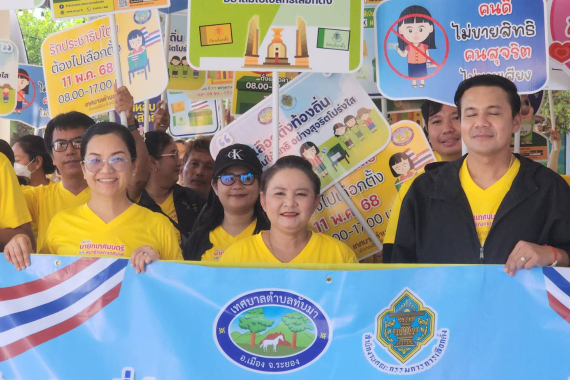 วันที่ 24 เม.ย.68 เวลา 17.00 น.ผู้สื่อข่าวรายงาน ว่า ที่บริเวณเทศบาลตำบลทับมา อ.เมือง จ.ระยอง น.ส.เรวีญา ขจิตเนติธรรม ปลัดเทศบาลตำบลทับมา ปฏิบัติหน้าที่นายกเทศมนตรีตำบลทับมา เป็นประธานปล่อยแถวเจ้าหน้าที่รณรงค์เชิญชวนให้ ปชช. ในพื้นที่ออกมาใช้สิทธิเลือกตั้งสมาชิกสภาเทศบาลและนายกเทศมนตรีตำบลทับมา ในวันที่ 11 พ.ค.68 นี้