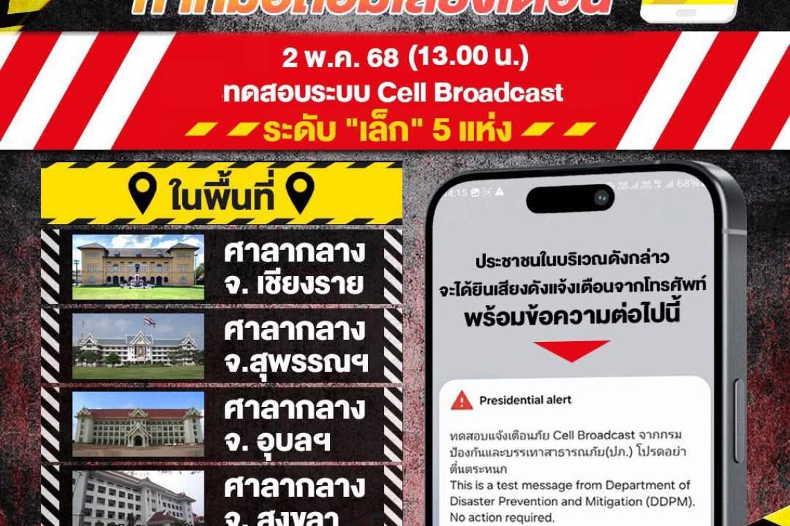 เพจกรุงเทพมหานคร ได้โพสต์ว่า วันนี้ (2 พ.ค.68) เวลาบ่ายโมง อย่าตกใจ หากมือถือของท่านมีเสียงเตือนดัง เนื่องจาก ปภ. ได้ทำการทดสอบแจ้งเตือนภัยระบบ Cell Broadcast ระดับเล็ก 5 แห่ง