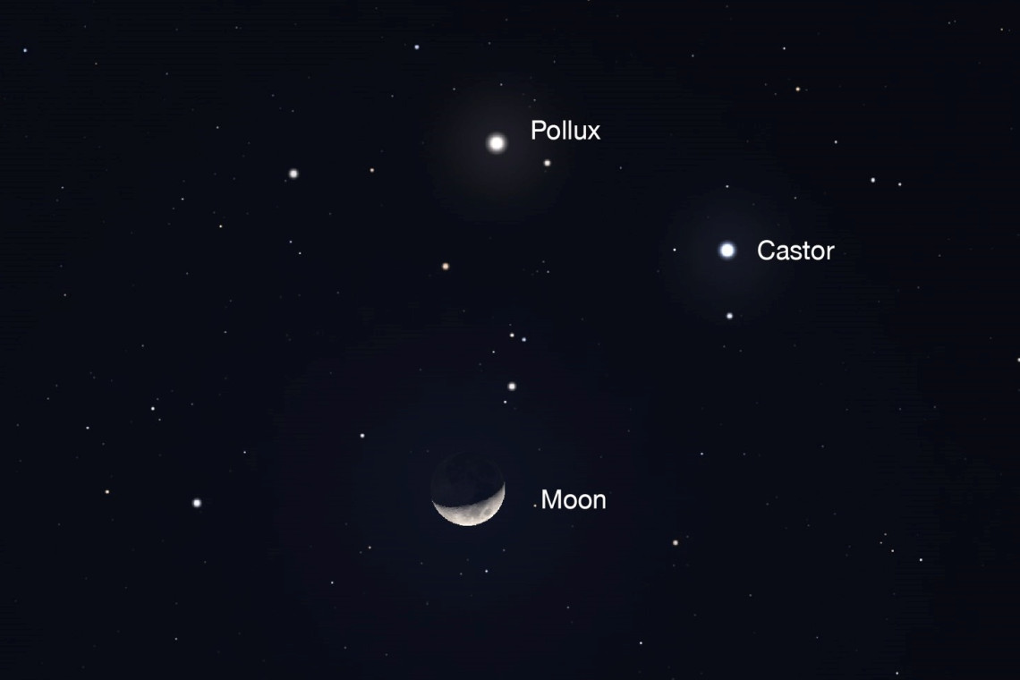 ดวงจันทร์เสี้ยว เคียงดาวพอลลักซ์ และดาวคาสเตอร์ แห่งกลุ่มดาวคนคู่ ชมความสวยงามได้หลังดวงอาทิตย์ลับขอบฟ้าเป็นต้นไป จนถึงเวลาประมาณ 23:00 น.