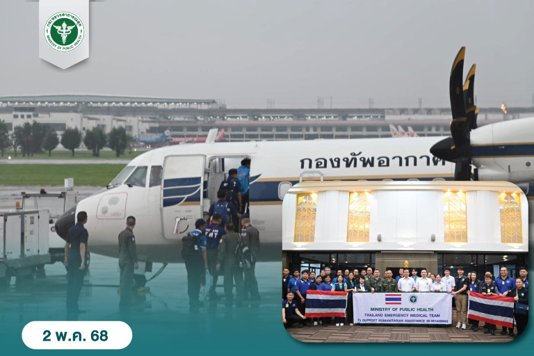 วันนี้ (2 พฤษภาคม 2568) ที่ท่าอากาศยานทหาร 2 (บน.6) ดอนเมือง กรุงเทพฯ นพ.โอภาส การย์กวินพงศ์ ปลัดกระทรวงสาธารณสุข มอบหมายให้ นพ.สุเมธ องค์วรรณดี นายแพทย์ทรงคุณวุฒิ กรมควบคุมโรค และคณะผู้บริหาร ร่วมส่งทีมปฏิบัติการฉุกเฉินทางการแพทย์และสาธารณสุขในภาวะภัยพิบัติ (Thailand Emergency Medical Team : Thailand EMT) ผลัด 4 เดินทางโดยเครื่องบินของกองทัพอากาศในเวลา 08.00 น.ไปยังสนามบินมัณฑะเลย์ สาธารณรัฐแห่งสหภาพเมียนมา เพื่อสนับสนุนช่วยเหลือผู้ประสบภัยแผ่นดินไหวในเมียนมา