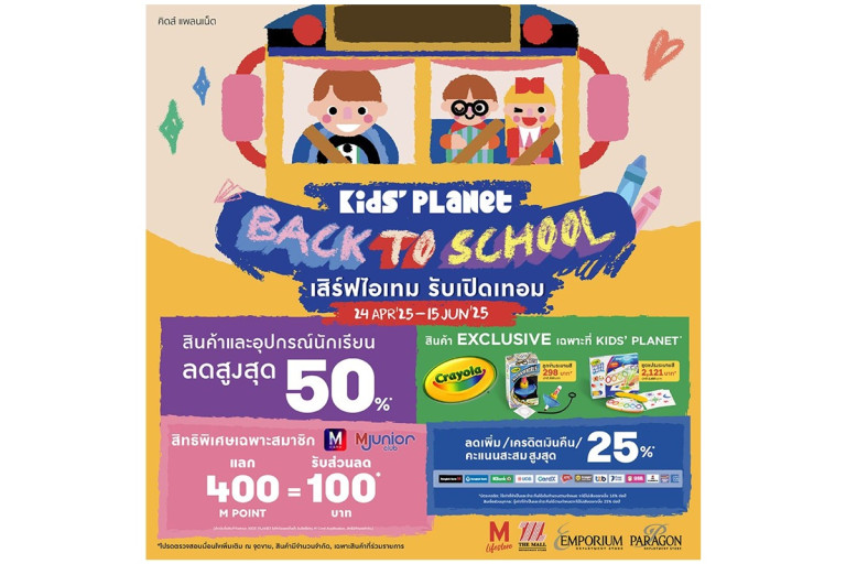 สัมผัสความครบครันกับหลากหลายไอเทมเด็ดรับเปิดเทอม พร้อมโปรโมชั่นจากแบรนด์ดังในงาน “KIDS’ PLANET BACK TO SCHOOL 2025” ตั้งแต่วันนี้ - 15 มิถุนายน 2568 ได้ที่แผนกคิดส์ แพลนเน็ต เดอะมอลล์ไลฟ์สโตร์ทุกสาขา, เดอะมอลล์โคราช, พารากอน และเอ็มโพเรียม ดีพาร์ทเม้นท์สโตร์ หรือติดตามรายละเอียดเพิ่มเติมได้ที่ FACEBOOK : KIDS' PLANET