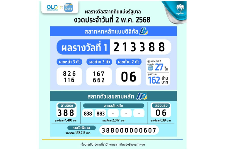 สลากดิจิทัล บนแอปฯเป๋าตัง ของธนาคารกรุงไทย งวดวันที่ 2 พ.ค. 68 เลขสลากรางวัลที่ 1: 213388 มีคนถูกรางวัลที่ 1 รวม 27 ใบ 162 ล้านบาท