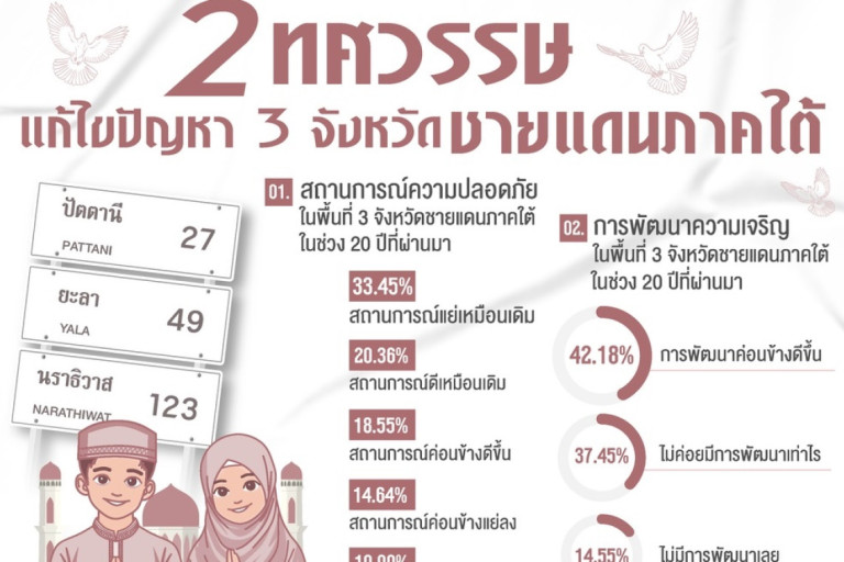 ด้านการพัฒนาความเจริญในพื้นที่สามจังหวัดชายแดนภาคใต้ในช่วง 20 ปีที่ผ่านมา พบว่า ตัวอย่าง ร้อยละ 42.18 ระบุว่า การพัฒนาค่อนข้างดีขึ้น รองลงมา ร้อยละ 37.45 ระบุว่า ไม่ค่อยมีการพัฒนาเท่าไร ร้อยละ 14.55 ระบุว่า ไม่มีการพัฒนาเลย และร้อยละ 5.82 ระบุว่า การพัฒนาดีขึ้นมาก