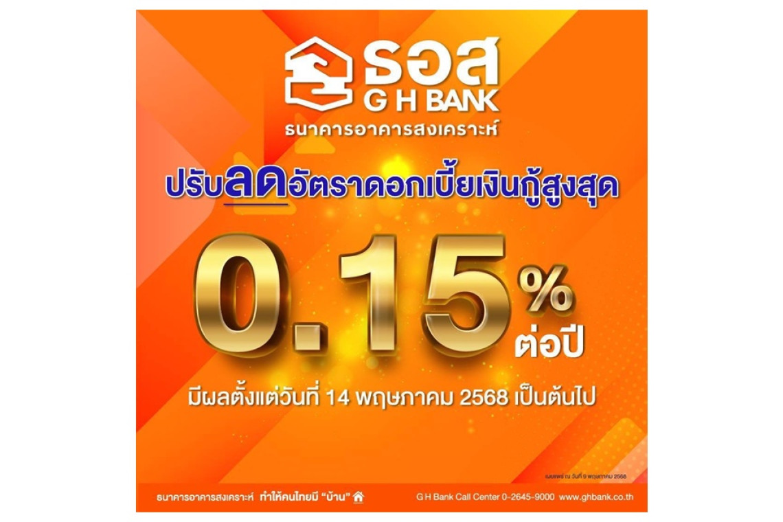 ธอส.ประกาศลดอัตราดอกเบี้ยเงินกู้สูงสุด 0.15% ต่อปี ลดภาระด้านที่อยู่อาศัยให้ลูกค้า และกระตุ้นภาคอสังหาริมทรัพย์ มีผลตั้งแต่วันที่ 14 พฤษภาคม 2568 เป็นต้นไป