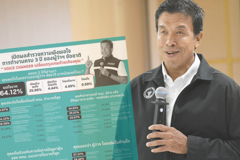 พบว่า ตลอด 3 ปีที่ผ่านมา กลุ่มตัวอย่างร้อยละ 64 .12 มีความพอใจในผลงานของผู้ว่าฯ ชัชชาติ ถัดมาเป็นเรื่องการทำงานของผู้ว่าฯ ชัชชาติโดดเด่นในด้านใด กลุ่มตัวอย่างร้อยละ 37.32 ระบุว่าผู้ว่าฯ ชัชชาติ พร้อมรับฟังความคิดเห็น ทำงานใกล้ชิดประชาชน รองลงมาร้อยละ 34.48 ระบุว่า ผู้ว่าฯ ชัชชาติทำงานหนัก และร้อยละ 27.47 ระบุว่า เป็นนักพัฒนา มีความคิดทันสมัยตลอดเวลา พร้อมปรับตัว และนำนวัตกรรมมาใช้