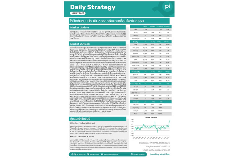 วันที่ 14 พฤษภาคม 2568 บล.พาย เผยว่า ตลาดหุ้น Dow Jones เมื่อคืนปิดลบ 269 จุด (-0.6%) ถูกกดดันจากการปรับลงของหุ้น United Health หลังจากบริษัทระงับการเปิดเผยคาดการณ์ตัวเลขผลประกอบการในปี 25 ด้านราคาน้ำมันดิบ BRT ปิดบวก 2.57% ได้ปัจจัยบวกจากการที่สหรัฐฯและจีนบรรลุข้อตกลงการค้าชั่วคราว