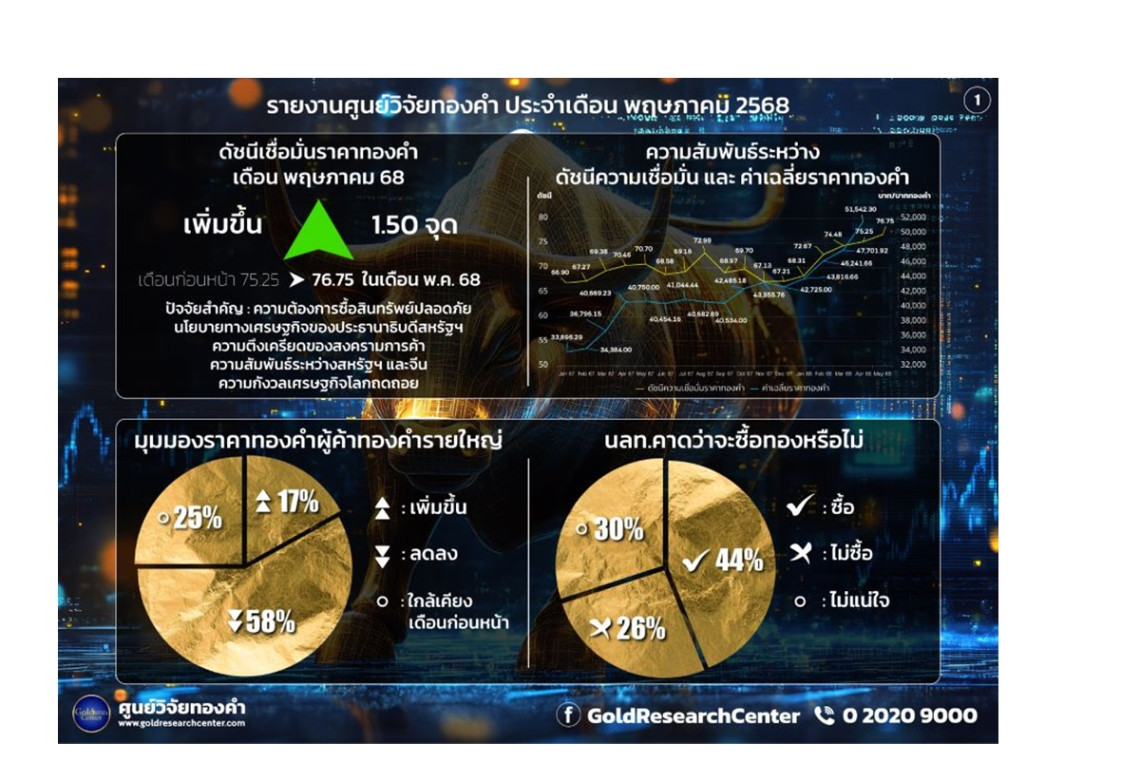 นายพิบูลย์ฤทธิ์ วิริยะผล ผู้อำนวยการศูนย์วิจัยทองคำ เผยดัชนีความเชื่อมั่นราคาทองคำประจำเดือน พ.ค.68 อยู่ที่ระดับ 76.75 จุด ปรับเพิ่มขึ้น 1.50 จุด หรือ 1.99% จากเดือน เมย.68 ที่ระดับ 75.25 จุด โดยมีปัจจัยหนุนให้ดัชนีฯ ปรับเพิ่มขึ้นจากความต้องการซื้อสินทรัพย์ปลอดภัย นโยบายทางเศรษฐกิจของประธานาธิบดีสหรัฐฯ ความตึงเครียดของสงครามการค้า และความกังวลเศรษฐกิจโลกถดถอย โดยคาดการณ์ความต้องการซื้อทองคำในช่วงเดือน พ.ค.68 จากกลุ่มตัวอย่างจำนวน 344 ราย ในจำนวนนี้มี 152 ราย หรือ 44% คาดว่าจะซื้อทองคำ ส่วนจำนวน 104 ราย หรือ 30% ไม่แน่ใจว่าจะซื้อทองคำในเดือนนี้หรือไม่ และจำนวน 88 ราย หรือ 26% คาดว่าจะไม่ซื้อทองคำ