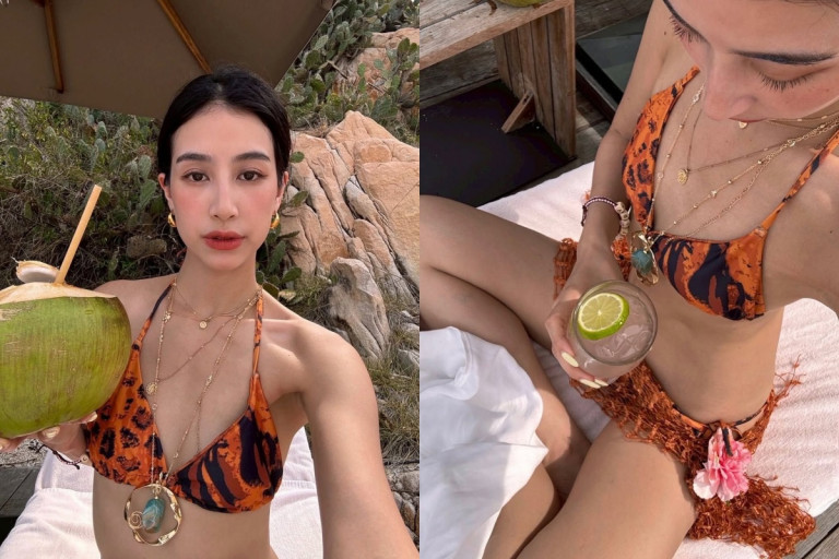 ท่ามกลางวิวทะเลและภูมิทัศน์ที่งดงาม มิ้นต์ไม่พลาดที่จะเสริมความโดดเด่นด้วยเครื่องประดับทองที่ให้ความรู้สึกหรูหราแต่ไม่ดูโอเวอร์ การเลือกชุดบิกินี่ลายเสือโคร่งยิ่งเพิ่มความน่าสนใจให้กับลุคนี้