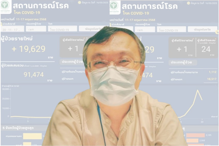 “หมอธีระ” เตือน! โควิด-19 กลับมาระบาดรุนแรงอีกครั้ง ยอดผู้ป่วยปี 2568 ทะลุ 90,000 รายแล้ว ขณะที่เพียง 5 วันแรกของสัปดาห์ที่ 20 พบผู้ติดเชื้อรายใหม่เกือบ 20,000 คน ยังไม่รวมผู้ที่ป่วยแต่ไม่ได้ไปรับการรักษาในโรงพยาบาล