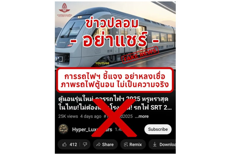 การรถไฟฯ เตือนอย่าหลงเชื่อหรือแชร์คลิปวิดีโอปลอมบนโซเชียล เรื่อง “ตู้นอนรุ่นใหม่ การรถไฟฯ 2025 หรูหราสุดในไทย!ไม่ต้องนอนโรงแรม!”