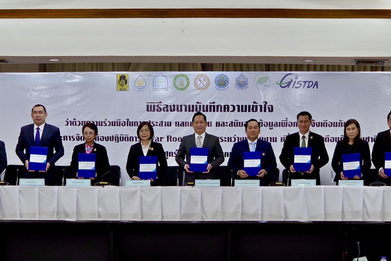 16 พฤษภาคม 2568 สำนักงานพัฒนาเทคโนโลยีอวกาศและภูมิสารสนเทศ (องค์การมหาชน) หรือ GISTDA ภายใต้กระทรวงการอุดมศึกษา วิทยาศาสตร์ วิจัยและนวัตกรรม (อว.) ลงนามบันทึกความเข้าใจ (MOU) กับ 8 หน่วยงานภาครัฐ ได้แก่ กรมป้องกันและบรรเทาสาธารณภัย สำนักงานทรัพยากรน้ำแห่งชาติ กรมควบคุมมลพิษ กรมอุตุนิยมวิทยา กรมทรัพยากรธรณี กรมชลประทาน กรมทรัพยากรน้ำ และสถาบันสารสนเทศทรัพยากรน้ำ (องค์การมหาชน) เพื่อร่วมมือกันประสานงาน แลกเปลี่ยน และสนับสนุนข้อมูลเพื่อการแจ้งเตือนภัยและการจัดตั้งห้องปฏิบัติการ (War Room) ร่วมกันระหว่างหน่วยงาน เพื่อการแจ้งเตือนภัยของชาติ โดยพิธีลงนามจัดขึ้น ณ ห้องประชุม 1 ปภ. อาคาร 3 ชั้น 5 กรมป้องกันและบรรเทาสาธารณภัย