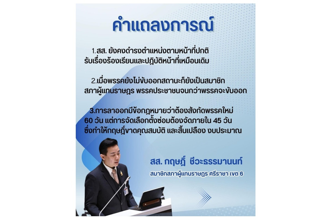 2.เมื่อพรรคยังไม่ขับออกสถานะก็ยังเป็นสมาชิกสภาผู้แทนราษฎรพรรคประชาชนจนกว่าพรรคจะขับออก