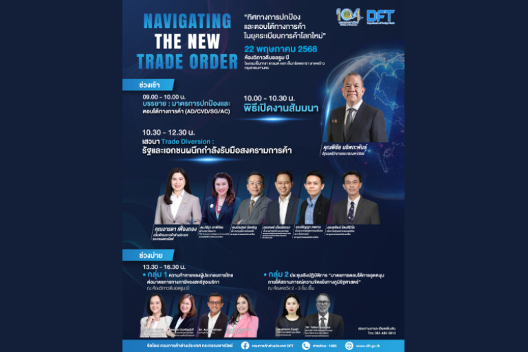 ทั้งนี้ ทุกท่านยังสามารถติดตามรับชม งานการจัดสัมมนาและการประชุมเชิงปฏิบัติการ ในหัวข้อ “Navigating the New Trade Order : ทิศทางการปกป้องและตอบโต้ทางการค้าในยุคระเบียบการค้าโลกใหม่” ในวันพฤหัสบดีที่ 22 พฤษภาคม 2568 เวลา 08.30 – 16.30 น. ผ่าน Facebook Live ได้ที่ Facebook : กรมการค้าต่างประเทศ DFT