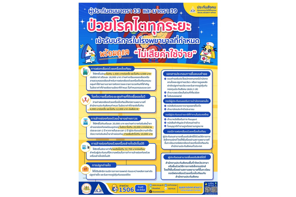 วันที่ 19 พฤษภาคม 2568 นางมารศรี ใจรังษี เลขาธิการสำนักงานประกันสังคม กล่าวถึงสถานการณ์ผู้ประกันตนป่วยเป็นโรคไตวายเรื้อรังมีจำนวนเพิ่มขึ้น ซึ่งส่งผลเสียต่อสุขภาพของผู้ป่วย และมีผลกระทบต่อระบบเศรษฐกิจของประเทศเป็นอย่างมาก “สำนักงานประกันสังคม พร้อมดูแลผู้ประกันตนมาตรา 33 และผู้ประกันตนมาตรา 39 ที่เจ็บป่วยด้วยโรคไตทุกระยะสามารถเข้ารับการรักษาในสถานพยาบาลที่กำหนดสิทธิโดยไม่เสียค่าใช้จ่ายแต่อย่างใด” กรณีผู้ประกันตนที่เจ็บป่วยด้วยโรคไตวายเรื้อรังระยะสุดท้าย สามารถรับสิทธิกรณีการบำบัดทดแทนไต ดังนี้