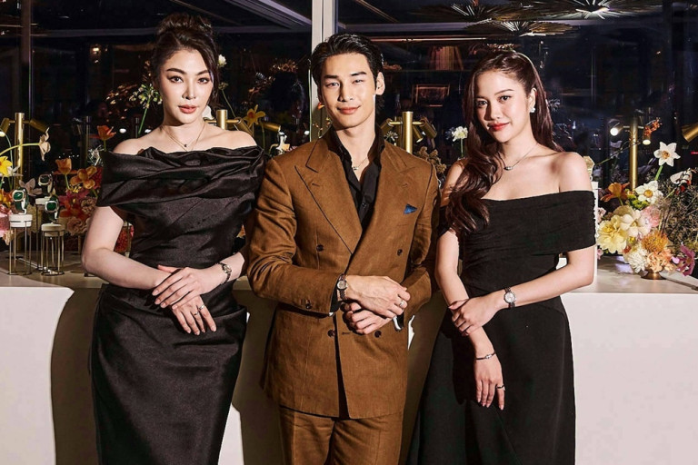 โดย อาโป-ณัฐวิญญ์ ปรากฏตัวในชุดสูทโทนสีน้ำตาลเรียบหรู คอมพลีตลุคด้วยเรือนเวลา Sixtie ตัวเรือนโรสโกลด์ ตกแต่งด้วยโมทีฟ Gadroon หนึ่งในซิกเนเจอร์สำคัญของนาฬิกา Andy Warhol ที่ถูกหยิบมานำเสนออย่างประณีตบนขอบตัวเรือน จับคู่กับเครื่องประดับโรสโกลด์ทั้งหมดจากคอลเลกชั่น Possession ขณะที่ ฟรีน-สโรชา มาในโททัลลุคสีดำสวมใส่นาฬิกา Sixtie ตัวเรือนสตีลขอบหน้าปัดประดับเพชร 51 เม็ด พร้อมสไตลิ่งด้วยจิวเวลรี่ไวท์โกลด์จากหลากคอลเลกชั่น ไม่ว่าจะเป็น ต่างหูจาก Piaget Rose, สร้อยคอ กำไล และแหวนจากคอลเลกชั่น Possession ปิดท้ายที่ ฝ้าย-พีรญา กับเรือนเวลา Sixtie ตัวเรือนสตีลผสมโรสโกลด์ พร้อมแมชต์ด้วยจิวเวลรี่ทั้งหมดจากคอลเลกชั่น Possession