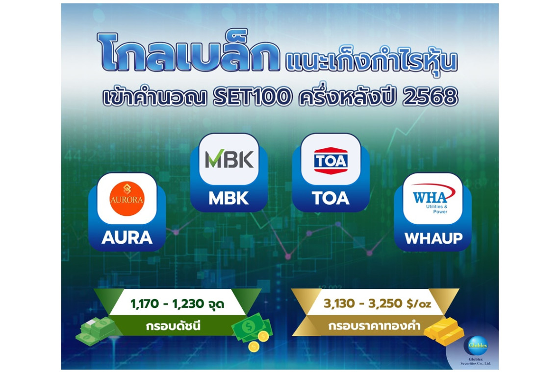 นายวัชเรนทร์ จงยรรยง ผู้อำนวยการฝ่ายวิจัย บล.โกลเบล็ก แนะนำกลยุทธ์การลงทุนในหุ้นที่คาดการณ์ว่าจะมีการนำเข้าคำนวณดัชนี SET100 ในรอบครึ่งปีหลังของปี 2568 ที่จะประกาศราวกลางเดือนมิ.ย. นี้ ได้แก่ AURA, MBK, TOA และ WHAUP