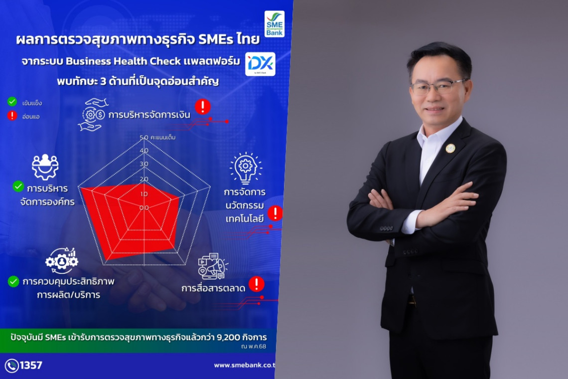 SME D Bank เผยผลตรวจสุขภาพธุรกิจผู้ประกอบการเอสเอ็มอีผ่านระบบ Business Health Check ในแพลตฟอร์ม “DX by SME D Bank” (dx.smebank.co.th) พบจุดอ่อนสำคัญ 3 ด้าน ได้แก่ ด้านบริหารการเงิน ด้านจัดการนวัตกรรม-เทคโนโลยี และด้านการตลาด ประกาศเดินหน้าช่วย “เติมความรู้คู่เงินทุน” เสริมศักยภาพให้เข้มแข็ง ปิดจุดอ่อน สามารถก้าวผ่านอุปสรรคได้ในทุกสถานการณ์