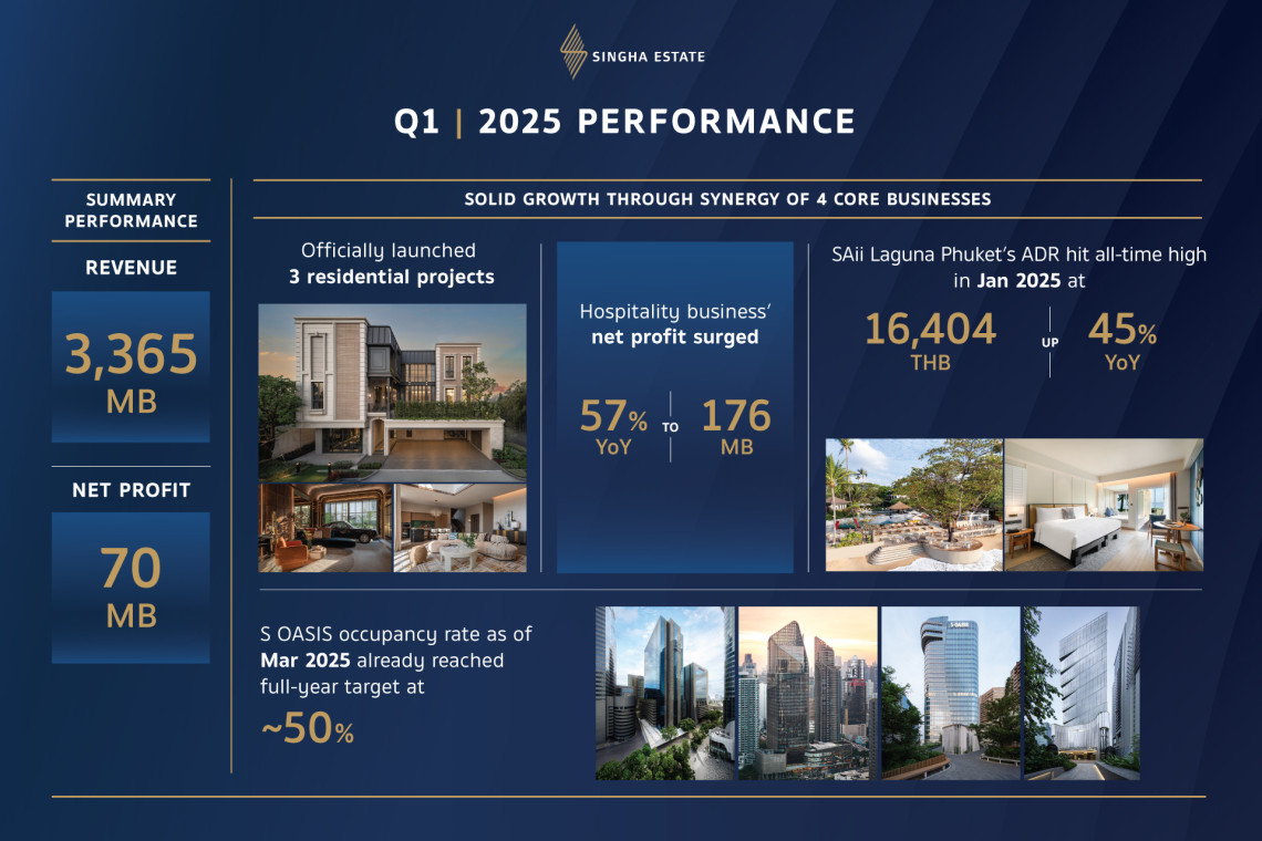 บริษัท สิงห์ เอสเตท จำกัด (มหาชน) หรือ (SET: S) ประกาศผลการดำเนินงานประจำไตรมาส 1 ปี 2568 มีรายได้หลักจากการดำเนินงานรวม 3,365 ล้านบาท แบ่งเป็นสัดส่วนรายได้ประจำ (Recurring Income) จากธุรกิจโรงแรมและอาคารสำนักงานที่ประมาณร้อยละ 87 และรายได้ไม่ประจำ (Non-Recurring Income) จากธุรกิจที่พักอาศัยที่ร้อยละ 13 ตอกย้ำกลยุทธ์การดำเนินงานในทิศทางที่มั่นคง มีกระแสเงินสดต่อเนื่อง โดยเฉพาะในภาวะเศรษฐกิจที่มีความไม่แน่นอนสูงในโลกปัจจุบัน
