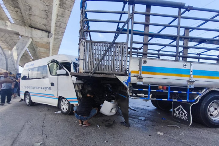 วันที่ 20 พ.ค.68 ร.ต.ท.กิตติกูล พันกองแก้วร้อยเวรสอบสวน สภ.เมืองสมุทรสาคร ได้รับแจ้งมีอุบัติเหตุรถตู้โดยสารสาธารณะชนกับรถบรรทุก 6 ล้อ บนถนนพระราม 2 ช่องทางหลัก ฝั่งขาออกกรุงเทพ มีผู้ได้รับบาดเจ็บหลายราย จึงรีบประสานไปยังหน่วยกู้ชีพและ โรงพยาบาลใกล้เคียง พร้อมอุปกรณ์ตัดถ่างเข้าให้การช่วยเหลือผู้บาดเจ็บที่มากับรถตู้โดยสารสาธารณะ