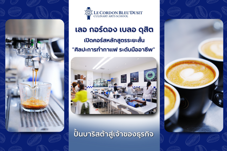 โรงเรียนสอนการประกอบอาหาร เลอ กอร์ดอง เบลอ ดุสิต (Le Cordon Bleu Dusit Culinary Arts School) จึงขอแนะนำหลักสูตรระยะสั้นสำหรับเมนูกาแฟ “ศิลปะการทำกาแฟ ระดับมืออาชีพ” ที่ได้ออกแบบมาเพื่อมอบองค์ความรู้และทักษะสำคัญสำหรับการเป็นบาริสต้ามืออาชีพอย่างรอบด้าน เหมาะอย่างยิ่งสำหรับผู้ที่ต้องการยกระดับฝีมือและนำไปต่อยอดธุรกิจร้านอาหารหรือคาเฟ่ที่มีเมนูกาแฟเป็นจุดขาย