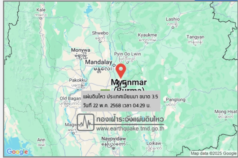 โดยแผ่นดินไหว 4ครั้งกลางดึกสงัดในเมียนมาก่อนรุ่งขึ้นวันนี้( 22 พ.ค.68)ที่เกิดขึ้น 3ครั้งติดต่อกันได้แก่เกิดขึ้นเวลา 04.25น.ขนาด 1.9ริกเตอร์ ความลึก 10 กิโลเมตร และต่อมาเวลา04.29น.ขนาด3.5ริกเตอร์ ความลึก10กม. และเวลาต่อมา 04.52น.เกิดความแรงขนาด 2.3ริกเตอร์ ขนาดความลึก10กม. ก่อนที่ข่วงเวลา.05.37น.จะเกิดแผ่นดินไหวส่งท้ายก่อนฟ้าสว่างอีกขนาด3.3ริกเตอร์ ขนาดความลึก10กม.